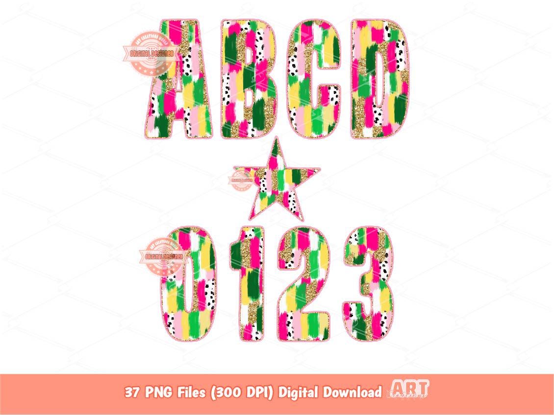 Instant Download Original Designer Colorful Brushstroke Alphabet PNG, Neon Pink Green gold Glitter Dalmatian print Brush Strokes letters & numbers 0-9 Clipart Popular Preppy Christmas Alpha Set Png for Sublimation and Dtf Digital Download. Message me for custom Letters colors.