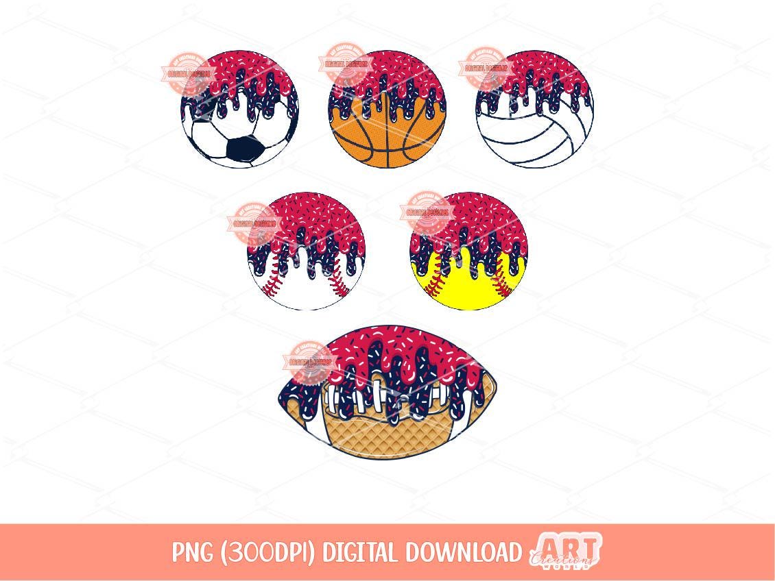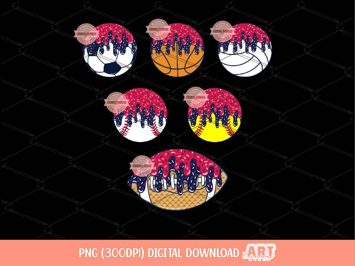 Instant Download Original Designer Red and Navy Blue Drip Sports Balls PNG Bundle, Baseball Softball Basketball Volleyball Football Soccer Ball Drippy Ice Cream Game Day Clipart Png files for Sublimation dtf Shirt Design Digital Download