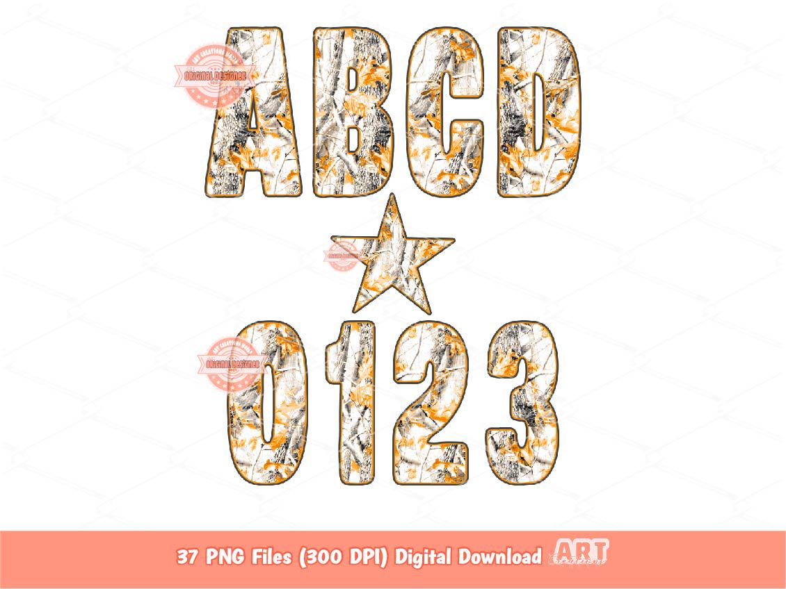 Instant Download Original Designer Fall Forest Camo Alphabet PNG, Realistic Camouflage Gray Orange Real Tree Hunting Army letters & numbers 0-9 Clipart Retro Military Autumn Leaves Camo Alpha Set Png for Sublimation and Dtf Digital Download. Message me for custom Letters colors.