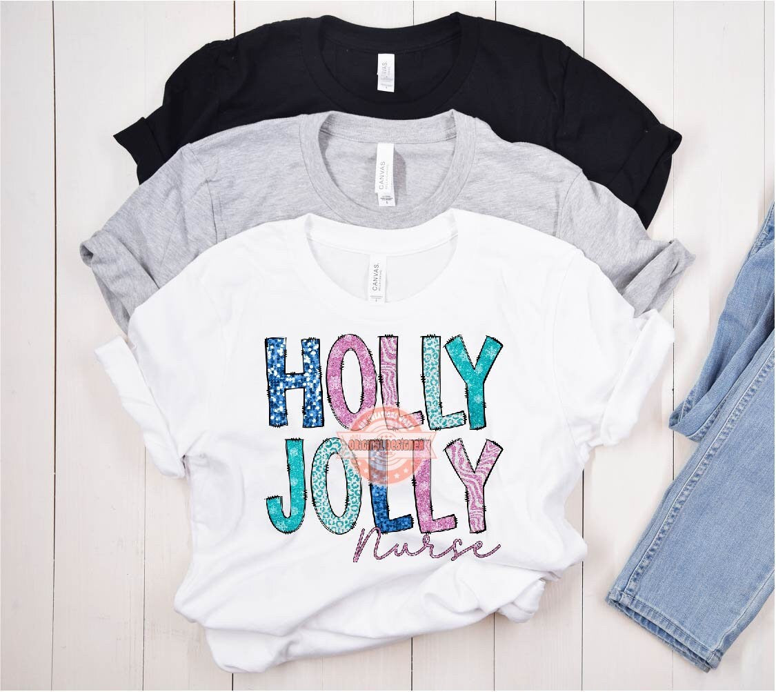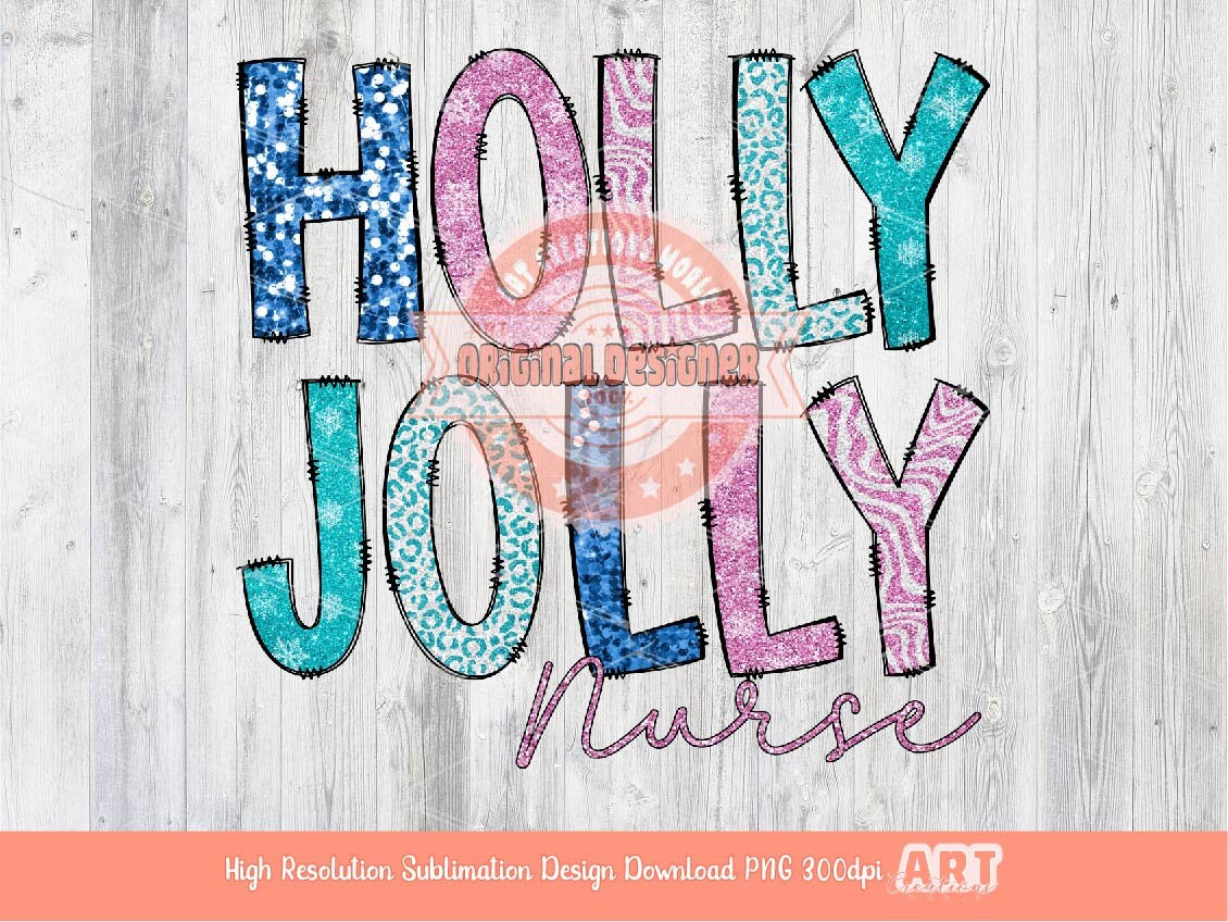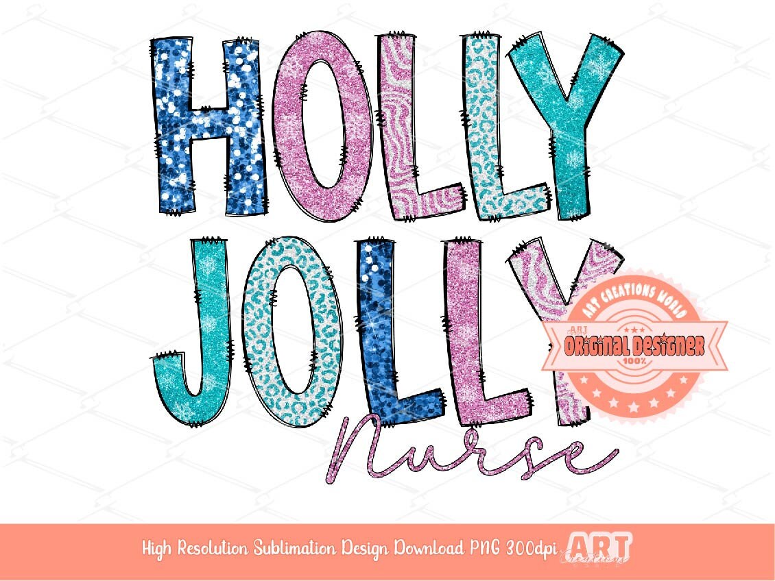 Instant Download Original Designer Holly Jolly Nurse Glitter Sequin PNG, Sparkle Pink Teal Blue Doodle letters Christmas PNG Sublimation & DTF T Shirt Design Download