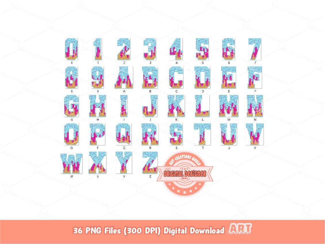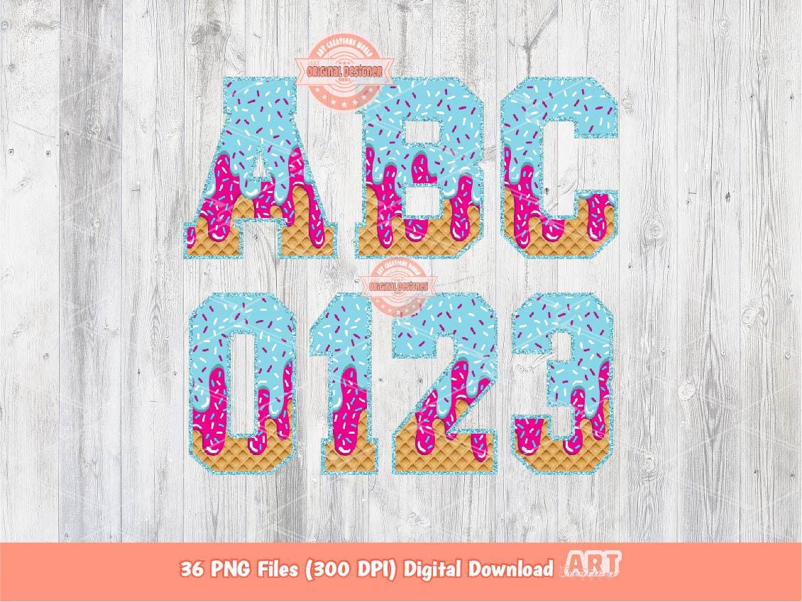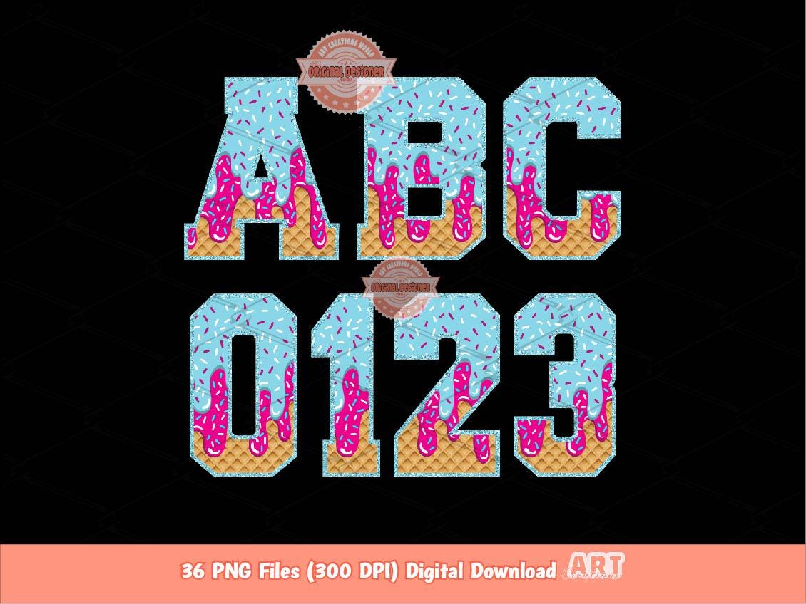 Instant Download Original Designer Pink Blue Drip Varsity Alphabet PNG, Trendy Sprinkle Drippy Ice Cream Sports letters and numbers 0-9 Clipart, Waffle Cone Alpha set PNG Files for Sublimation and Dtf Digital Download. Message me for custom Letters colors.