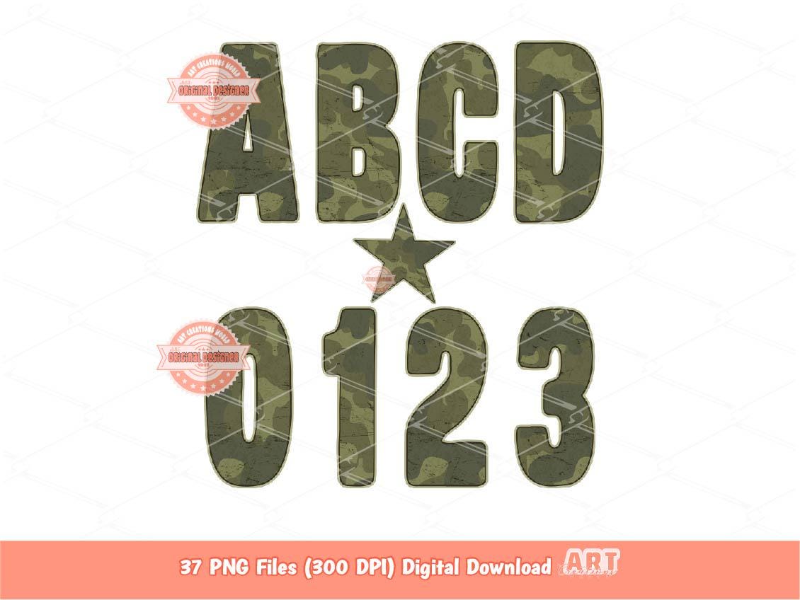 Instant Download Original Designer Retro Camo Alphabet PNG, Grunge Distressed Camouflage Hunting Army letters & numbers 0-9 Clipart Old School Military Camo Alpha Set Png for Sublimation and Dtf Digital Download. Message me for custom Letters colors.