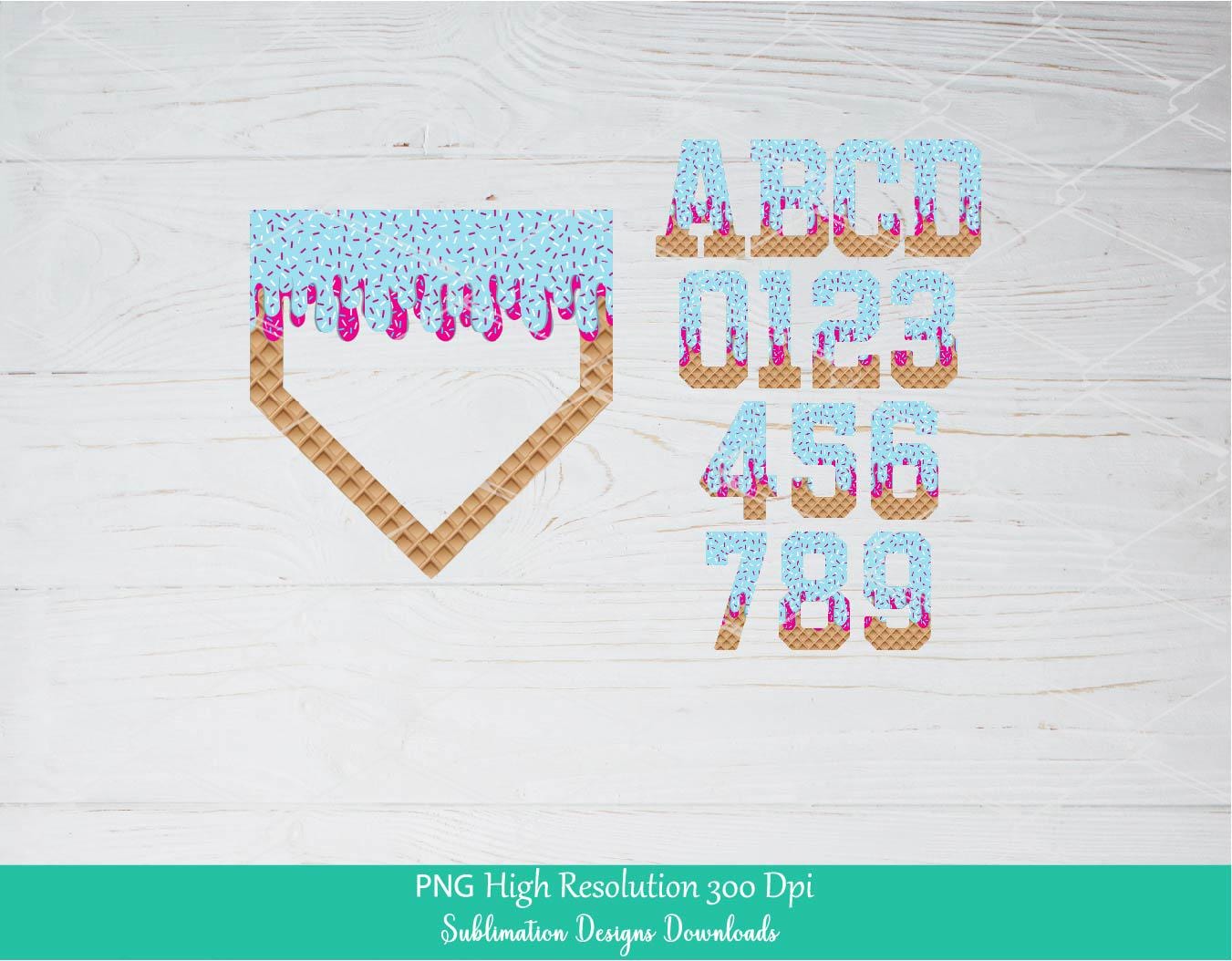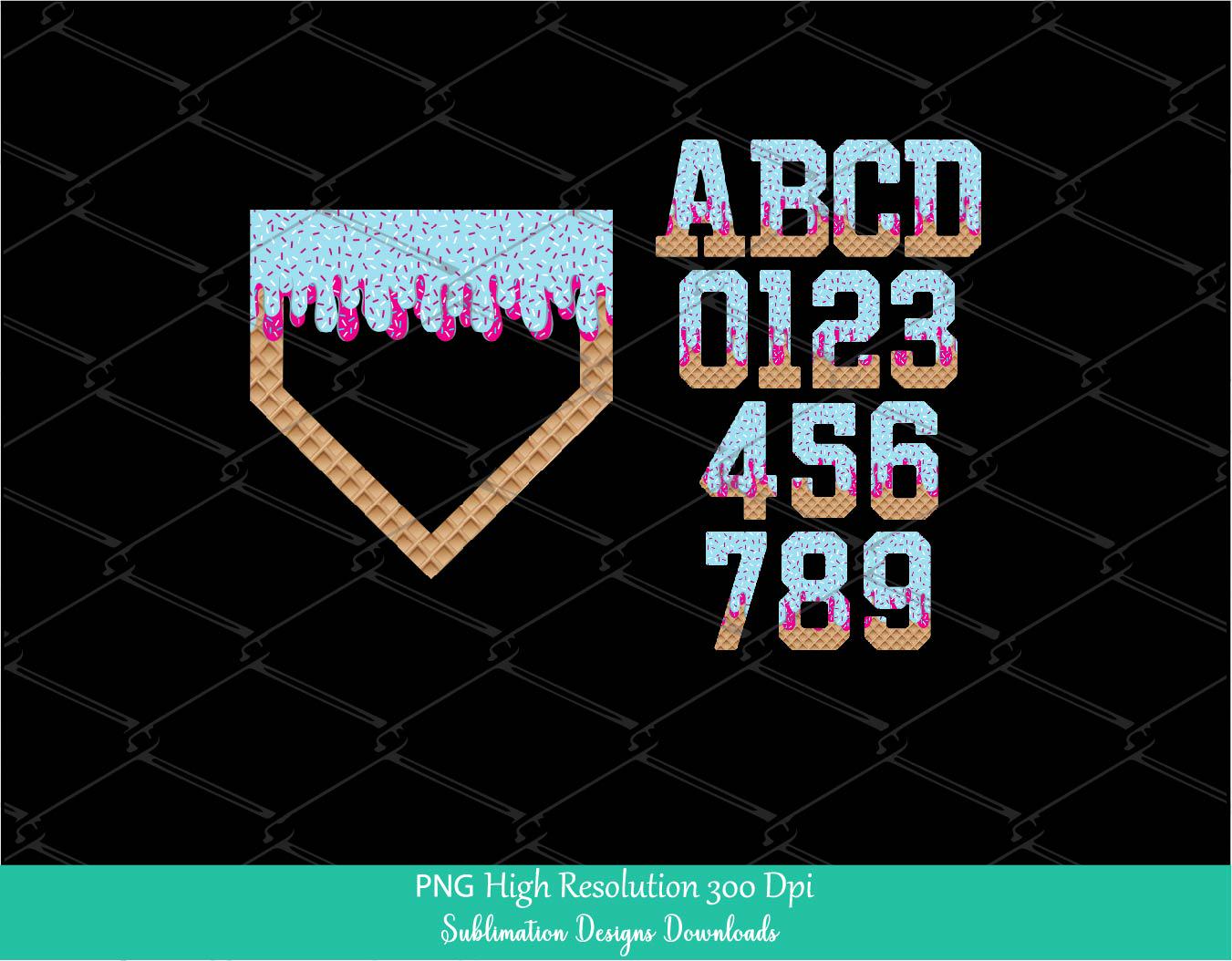 INSTANT DOWNLOAD Sprinkle Drip Home Plate Alphabet Set PNG Bundle, Pink & Blue Drippy Ice cream Cone Waffle Trendy Sport Alpha Png, Letters & Number 0-9, Custom Varsity College School Alphabet set for Sublimation and Dtf